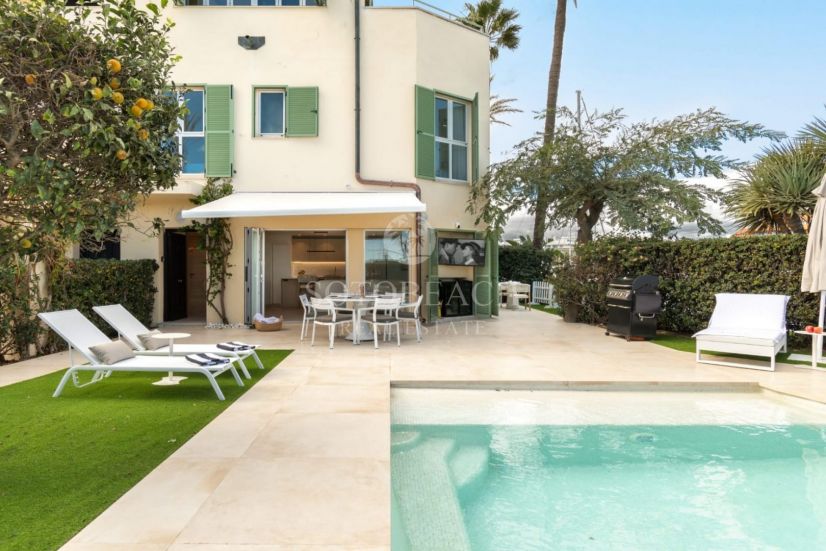 This is one of the most exclusives properties in Sotogrande, beacause of its location, views, and quality. Just a 1-minute walking from the beach, practically on the beachfront, and in the best area of the Sotogrande marina, with panoramic views of the Mediterranean Sea, the beach, and the port of Sotogrande. It features a large private garden with a private pool and a berth included in the price, allowing you to keep a boat right next to your home.