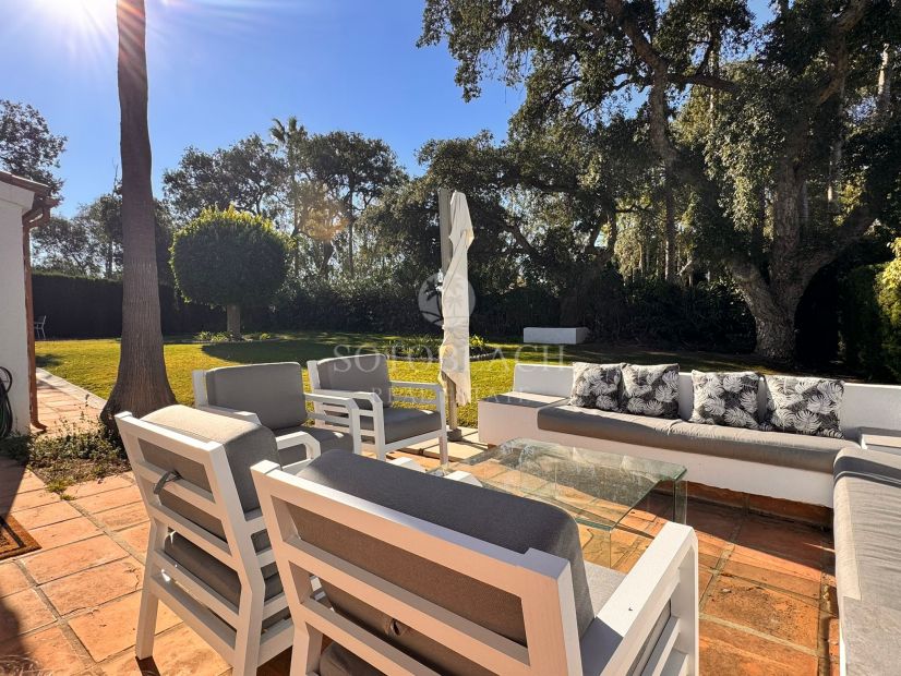 Villa de corte tradicional situada en una buena zona de Sotogrande, la propiedad consiste en un hall de entrada que conduce a un gran salon comedor con chimenea y con acceso a una terraza cubierta sobre el jardin y a una terraza descubierta.
